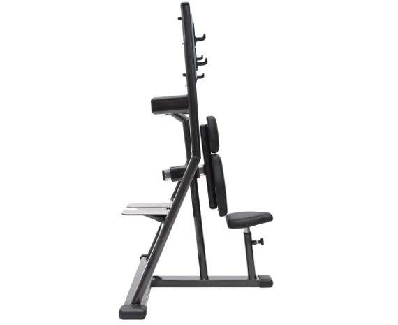 Прочные держатели для штанги выполнены в виде накладок из твердой закаленной стали, что защищает раму от ударов штанги. Двухуровневая система фиксации штанги позволяет пользователю выбрать удобное положение для снаряда, независимо от техники выполнения упражнений и длины рук.