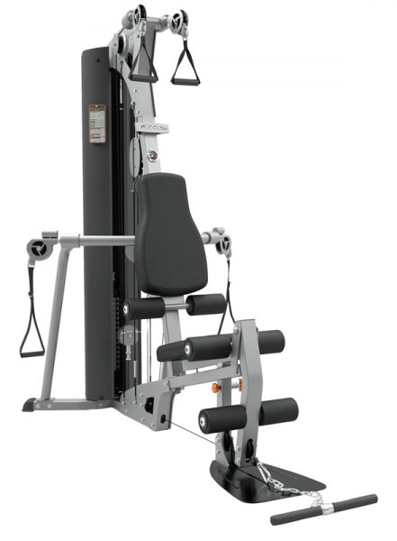 В комплекте: вращающийся гриф для нижней горизонтальной тяги, ремень на лодыжку, две пары рукоятей на "мягких ремнях", весовой стек 73 кг с защитными кожухами.