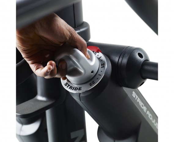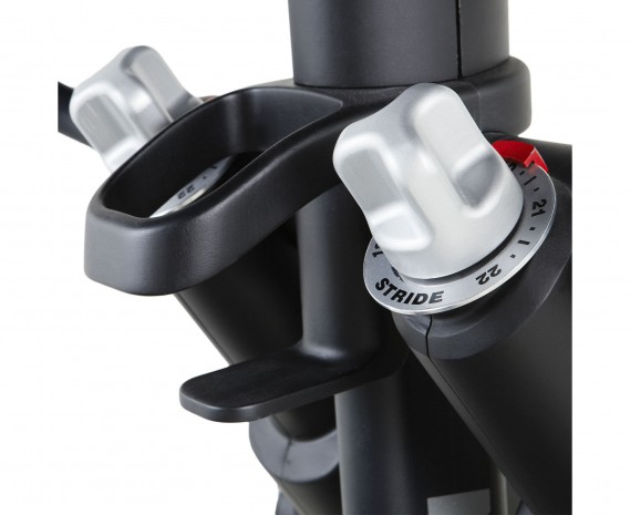 Компактный кросс-тренажер имеет размеры почти в два раза меньшие по сравнению с обычными эллиптическими тренажерами, как переднеприводными, так и заднеприводными. Тренажер оснащен маховиком, который расположен слева. Тяжелый маховик, вес которого составляет 11 кг, обеспечивает более плавные движения. Расположенные в центре тренажера педали с небольшим Q-фактором обеспечивают лучший баланс, уменьшают нагрузку на суставы, увеличивая безопасность тренировок. Благодаря данному конструктивному решению удалось максимально уменьшить расстояние между педалями, за счет чего достигается естественность движений.