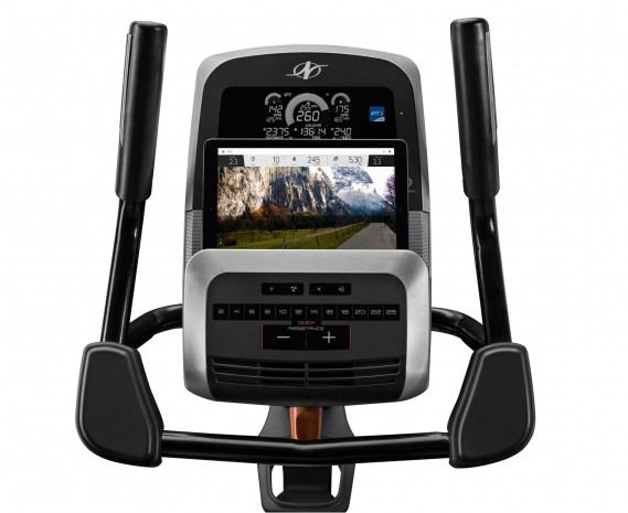 Компактный современный велотренажер отличается вертикальной посадкой, оснащен комфортным сидением с удобными мягкими подлокотниками. При помощи функции регулировки сидения и положения руля можно подобрать комфортную посадку, оптимальная нагрузка обеспечивается за счет установки тяжелого маховика, вес которого составляет 9 кг, предусмотрено наличие 25 уровней электромагнитного сопротивления. Управлять нагрузкой можно при помощи одного касания OneTouch, возможности современной консоли предусматривает простоту настройки нужной программы. Этот тренажер оснащен 30 программами, регулируемым вентилятором и звуковой системой. Для повышения комфорта на тренажере также установлены специальный держатель для бутылки и полка для хранения гаджетов.