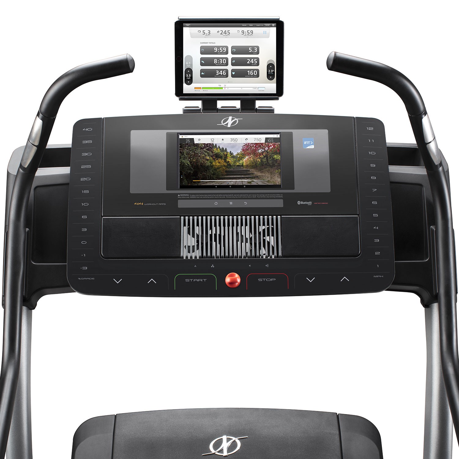 Консоль обеспечивает доступ к бесплатному приложению iFit, которое позволяет записывать и отслеживать информацию о тренировках. Кроме того, Bluetooth® подключение обеспечивает соединение с беспроводными пульсометрами, совместимыми с данной консолью. Частоту сердцебиения можно также измерять с помощью сенсорных кардиодатчиков, встроенных в рукоятки беговой дорожки. Следует отметить, что если одновременно пользоваться нагрудным и сенсорными кардиодатчиками, то данные нагрудного пульсометра будут в приоритете.