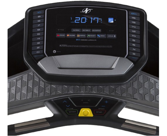Консоль беговой дорожки оснащена 5-ти дюймовым дисплеем, обеспечивающим высокую четкость изображения. Дисплей обеспечивает информативное отображение всех тренировочных параметров, необходимых для отслеживания тренировки, в том числе дистанции, скорости, угла наклона, темпа, времени тренировки, пульса, затраченных калорий, калорий, расходуемых за час и пр.