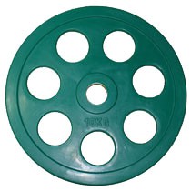 Олимпийский диск с хватом «Ромашка» весом 10 кг зеленого цвета имеет семь отверстий для хвата.