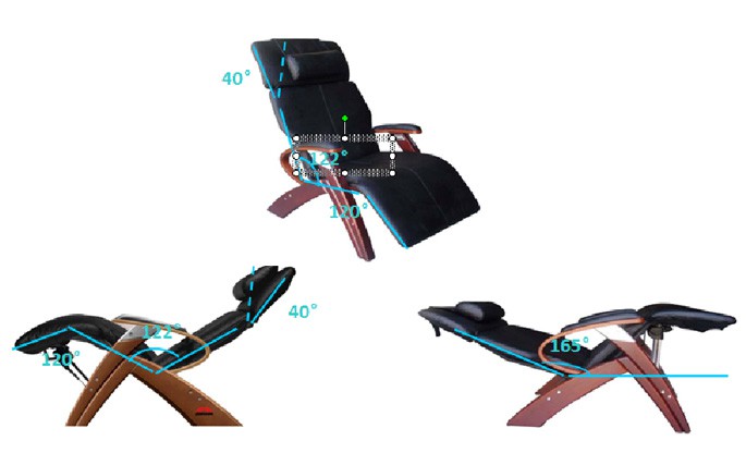 В кресле создается положение прямых углов. Во-первых, это массажное кресло можно расположить в совершенно правильном для отдыха положении или в «нейтральном» положении. Оно отлично подходит для поясничного отдела позвоночника (между туловищем и бедрами соблюдается угол наклона 125-135 градусов). Для каждого пользователя можно индивидуально настраивать угол такого размещения. Во-вторых, кресло, установленное в положение невесомости, снимает большее давление с поясницы, чем более «открытая» позиция.