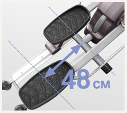За счет переднего расположения маховика конструкторам удалось добиться значительно лучшей траектории движения, уменьшения расстояния между педалями и увеличенной длины шага. В итоге тренировки на этом тренажере отличаются не только высокой эффективностью, но и максимальной безопасностью для суставов, в отличие от эллипсоидов с задним расположением маховика, которые не обеспечивают достаточно расфокусированную нагрузку на мышцы бедер и ног, но при этом оказывают излишнее давление на колени.