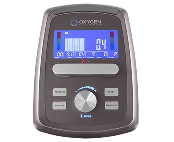 Консоль с 5.5-дюймовым многофункциональным LCD-дисплей обеспечивает доступ к функционалу тренажера. На синем экране белыми символами четко отображаются все тренировочные параметры, в том числе профиль, дистанция, время, скорость (обороты в минуту), калории, пульс, Ватты, показатели жироанализатора (Body Fat) и фитнес-теста (Recovery).