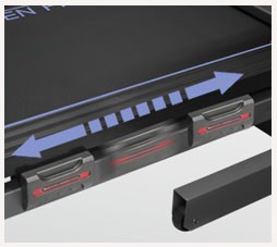 Ключевой конструктивной особенностью дорожки является инновационная амортизационная система, состоящая состоит из нескольких компонентов высокого класса исполнения. Толщина парафинированной двойной деки составляет 22 мм. Помимо этого встроены изменяемые эластомеры VCS™ коммерческого класса, что считается нетипичным для домашнего оборудования. Несомненным достоинством следует выделить многослойное полимерное полотно Habasit NVT-256, имеющее сложное плетение. Технологию внешней регулировки жесткости maxCOMFORT™ Adjustable Cushioning можно назвать изюминкой всего амортизационного пакета. Каждый занимающийся человек сможет настраивать подходящий уровень жесткости под свои индивидуальные предпочтения. Мягкая амортизация незаменима для спортсменов старшего возраста, чтобы существенно снизить нагрузку на суставы. Молодые и амбициозные пользователи ориентированы на скоростные тренировки, для чего потребуется установить амортизацию средней жесткости. Технология maxCOMFORT™ позволяет учесть запросы всех категорий спортсменов.