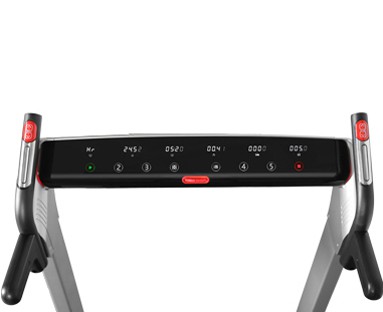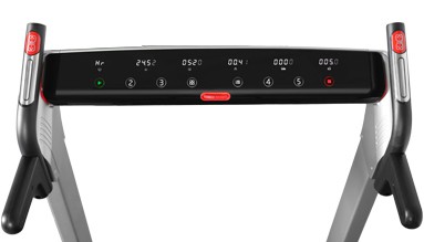 Консоль этой модели беговой дорожки представляет собой отличное решение не только с точки зрения дизайна, но и в смысле функционала. Она выполнена в виде панели, которая имеет черную акриловую поверхность. Управление консолью осуществляется при помощи сенсорных кнопок. Консоль с 6-ю буквенно-цифровыми экранами отображает все необходимые тренировочные параметры. Предустановленный программный пакет включает 8 различных режимов, которые позволяют добиваться решения самого широкого спектра задач, которые направлены на развитие выносливости и силы, укрепление сердечнососудистой системы, снижение веса и др. Пользователь может заниматься как с помощью встроенных программ, так и настраивать собственный режим тренировки, регулируя ее вручную. Предусмотрена также возможность создания персонального тренировочного профиля в одном из трех пользовательских режимов.