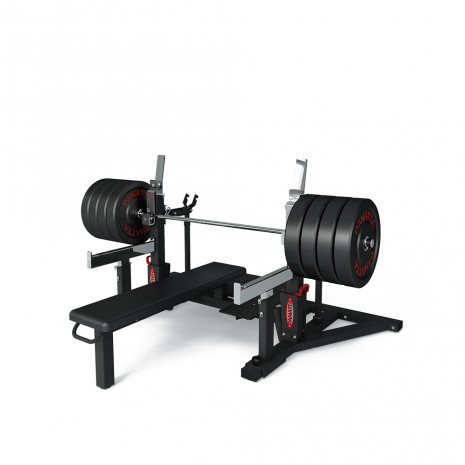 Для жима лежа предусмотрена встроенная страховочная платформа, устанавливаемая на стойку. Страховочная платформа имеет систему фиксации/разблокировки.