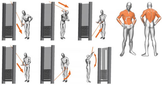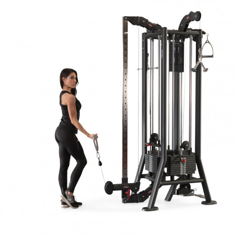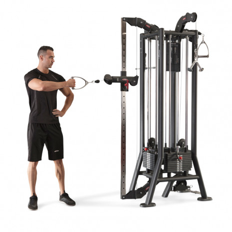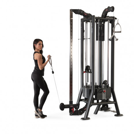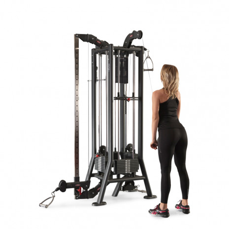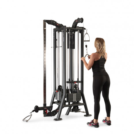На тренажере одновременно могут заниматься четыре человека. Каждое рабочее место схоже между собой, но есть некоторые отличия. У сторон разное количество блоков, только с одной стороны есть верхний и нижний блоки вместе. Также у сторон разные дополнительные опции (фиксатор ног, спинка, поручни), облегчающие выполнение упражнений. На одном из рабочих мест можно регулировать высоту блока.