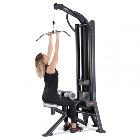 Силовой тренажер 1FE001 компании Panatta предназначен для развития мышц верхней части спины. В первую очередь тренажер помогает развить широчайшие мышцы. На нем можно выполнять тягу навесной ручки вниз. От того, какой тип навесной ручки для тяг используется, и от того, за голову или к груди выполняются тяги, зависит на какую часть широчайшей мышцы сместится нагрузка. С помощью данного тренажера можно выполнять упражнения на трицепс. На нем легко упражняться людям с высоким ростом (до 190 см), благодаря более высокой раме и более низкому сиденью.