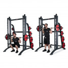 Две сварные рамы являются главным достоинством мощной конструкции. Они соединены между собой перемычками сверху и посередине. Рабочее звено представлено грифом, движущимся по двум вертикальным направляющим. Гриф движется по линейным подшипникам, которые достойно обеспечивают бесшумность хода и плавность. Вместе с кареткой гриф весит около 30 кг, что не позволяет заниматься людям со слабыми мышцами. Противовес, включающий два груза, служит для необходимой компенсации веса грифа. Такой универсальный противовес работает при подцеплении к каретке, либо он может быть просто отключен, если компенсировать вес грифа не требуется.