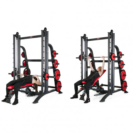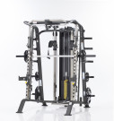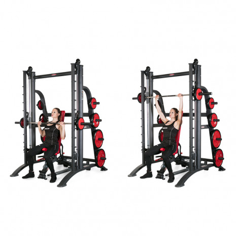 Две сварные рамы являются главным достоинством мощной конструкции. Они соединены между собой перемычками сверху и посередине. Рабочее звено представлено грифом, движущимся по двум вертикальным направляющим. Гриф движется по линейным подшипникам, которые достойно обеспечивают бесшумность хода и плавность. Вместе с кареткой гриф весит около 30 кг, что не позволяет заниматься людям со слабыми мышцами. Противовес, включающий два груза, служит для необходимой компенсации веса грифа. Такой универсальный противовес работает при подцеплении к каретке, либо он может быть просто отключен, если компенсировать вес грифа не требуется.