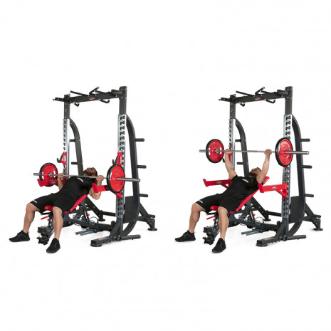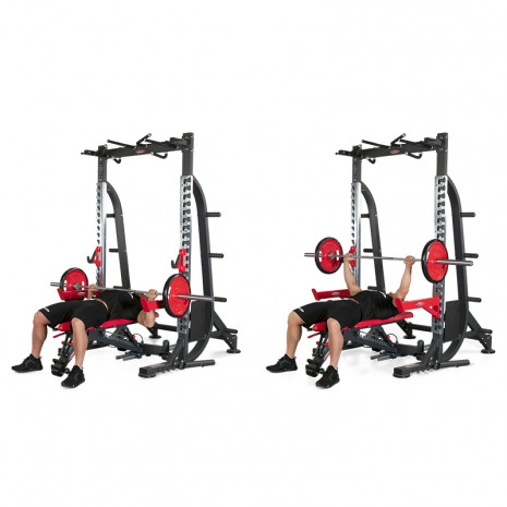 Отличный силовой тренажер 1HP234 компании Panatta - это прочная силовая полурама (односторонняя силовая стойка). Данная устойчивая конструкция в полной комплектации представлена с навесными поручнями для отжиманий и регулируемой скамейкой. Такая универсальная модель позволяет выполнять эффективные упражнения со штангой, благодаря чему можно качественно проработать все мышечные группы.