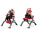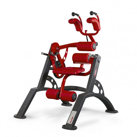 Конструкция оснащена специальным шарниром верхнего рычага, который плотно прижимает подушки к плечам спортсмена. Внизу и вверху встроены два универсальных валика, которые необходимы для полноценной фиксации поясничного отдела туловища. Несомненным достоинством тренажера можно выделить свободную подвеску сиденья. К сиденью производитель прикрепил специальный рычаг и опорные валики для ног. Во время скручивания в работу обязательно вовлекаются ноги, за счет чего пресс прорабатывается наиболее всестороннее, а также подключаются косые мышцы живота.