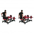 Несомненной особенностью конструкции является отсутствие поддерживающей спинки. Сиденье модели, дополнительно оборудованное особыми прижимными валиками, легко поворачивается на 180 градусов. Пользователь может располагаться лицом к тренажеру или лицом от оборудования. При повышенных рабочих весах используются два валика для надежной фиксации. Именно они отвечают за плотный прижим бедра занимающегося человека к полу. Для хранения нерабочих блинов встроены три парковочных рога на раме конструкции. Независимые рабочие рычаги дают возможность пользователям работать поочередно двумя руками или только одной рукой.