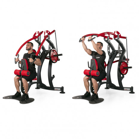 Отличный силовой тренажер 1HP503 компании Panatta добавит бескомпромиссный импульс профессионального подхода в интерьер любого спортзала. Модель идеально укрепляет мышцы верхней части спины, непосредственно воздействуя на широчайшую мышцу. Для выполнения упражнения тяги сверху пользователь должен занять положения сидя. Конструкция представляет собой модификацию популярного тренажера HP 501 Тяга вниз. Благодаря широким дугообразным движениям, данная модель положительно влияет на развитие широчайшей мышцы спины.