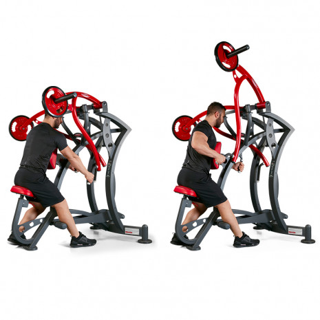 Ключевой отличительной особенностью является легкая регулировка положения сиденья по высоте. За счет чего пользователь может изменять угол амплитуды движений относительно своего тела. Дополнительным достоинством можно выделить свободную подвеску рукояток рабочих рычагов. Ось вращения рычагов полностью совпадает с супинацией предплечья. Перекрестное расположение рычагов обеспечивает необходимую компактность тренажера 1HP502. Для работы одной или поочередно двумя руками независимые рычаги размещены отдельно друг от друга. В процессе выполнения тяги грудь пользователя комфортно упирается в подушку. Прочная педаль легкого съема предназначена для удобного исходного положения и легкого схода с модели в конце занятия.