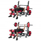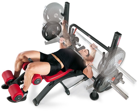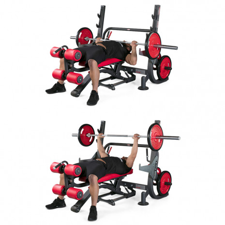 Штанга установленного веса представлена в качестве рабочей нагрузки. Ее необходимо установить на оптимальной высоте перед началом тренировки. Стойки модели оборудованы специальными крючками на двух уровнях. Для жимов перед грудью спортсмен занимает лежачее исходное положение на скамье, нажимает рычаг легкого старта для подводки рамы со штангой. Из этого положения следует снять штангу, а затем опустить педаль легкого старта. Необходимое количество повторений нужно выполнять без рывков в максимально равномерном темпе. Спортсмен должен сконцентрировать свое внимание только на правильной технике. Не следует забывать о разминке и растяжке тренируемых мышц перед первым подходом. В конце занятия рычагом легкого старта нужно подвести раму с крючками, чтобы штанга оказалась над грудью, после чего штанга плавно опускается на крючки.