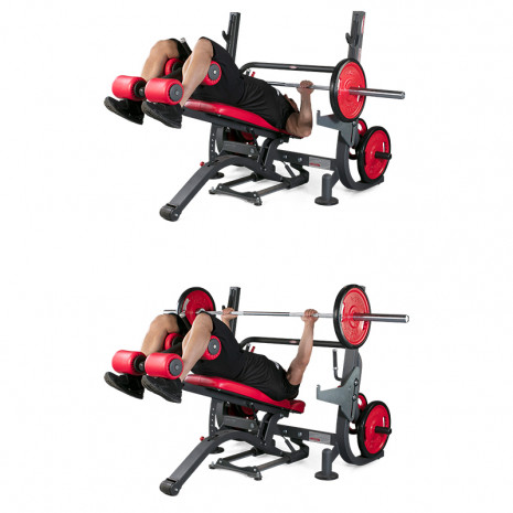 Спортивная скамья для жима под отрицательным углом 1HP206 имеет прочную сварную раму, оснащенную наклонной спинкой, валиками для фиксации ног и удобным подголовником. Чтобы пользователи могли заниматься с различными тренировочными грифами, производитель предусмотрел максимально широкое расположение стоек. При этом гарантировано устойчивое положение грифа. Скамья способна плавно передвигаться по двум направляющим в горизонтальном направлении, чтобы атлеты могли выполнять скручивания туловища, французский жим и пулловер. Для начального положения штанги модель обладает двумя парами крючков и страхующими кронштейнами. Поперечина на уровне груди и широкая платформа отвечают за эффективную тренировку и безопасность. Кроме того, следует выделить необходимую страховку спарринг-партнером.