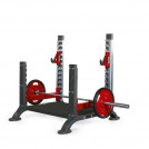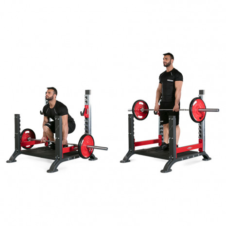 Становая тяга. Для выполнения упражнения потребуется штанга. В исходном положении она должна лежать на опорных поперечинах, представляющих собой прочные горизонтальные балки красного цвета. Перед началом тренировки спортсмен должен выбрать наиболее подходящую рабочую высоту поперечин. Поскольку минимальные показатели высоты поперечин над полом всегда соответствуют половине диаметра больших дисков Panatta Sport, то перед выполнением становой тяги обязательно проверяется высота поперечин для соответствующих дисков.