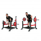 Шраги со штангой. Штанга в исходном положении должна лежать на крючках. Предварительно крючки надо расположить на оптимальной рабочей высоте, для чего ползуны красного цвета легко переставляются в нужные отверстия. В процессе выполнения данного упражнения пользователь занимает положение непосредственно на платформе, сконцентрировав все внимание на целевой мышце.