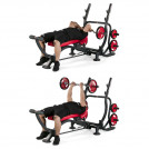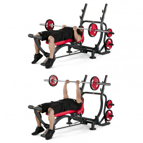 Уникальность конструкции этой спортивной скамьи заключается в прочной сварной раме, дополненной подголовником и горизонтальной спинкой. Между стойками имеется свободное пространство, чтобы пользователям было комфортно заниматься в различными тренировочными грифами. Для наилучшего начального положения штанги встроены четыре крючка. На уровне груди страхующего предусмотрена особая перекладина, которая отвечает за страховку спарринг-партнером и высокую степень безопасности на протяжении всей тренировки. По бокам рамы имеются четыре дополнительных дискодержателя для хранения дисков от штанги. Прочные опорные ножки тренажера будут устойчиво стоять на любой поверхности пола.