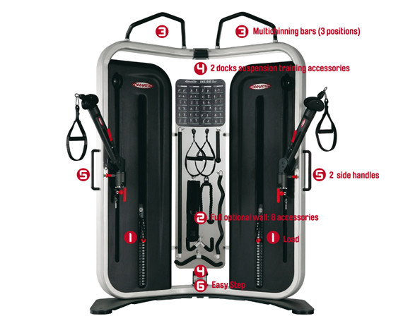 Inside объединяет в себе три тренажера в одном. Он состоит из двойного регулируемого блока, кроссовера и одинарного троса. За счет уникальной в области фитнеса системе High Range of Motion обеспечивается максимальная свобода движений. С тренажером Inside Вам доступна компоновка любых модульных схем, в том числе в центре зала, возле стены, звездой или спиной к спине.