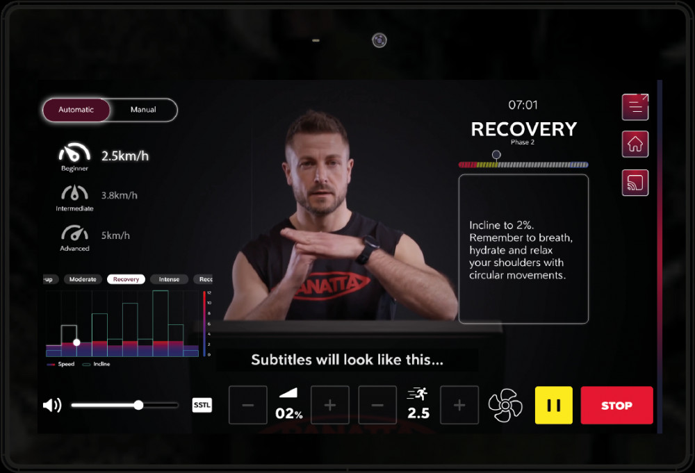 Новая учебная видеотека с интерактивной системой управления протоколом обучения, пошагово объясненной тренером. Свободный или автоматический режим видео помогает пользователю получить откалиброванные усилия с возможностью улучшения с течением времени.