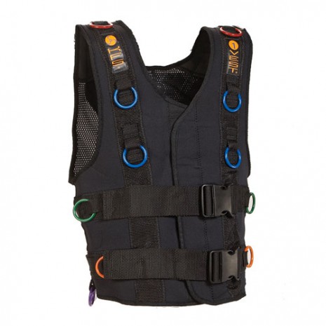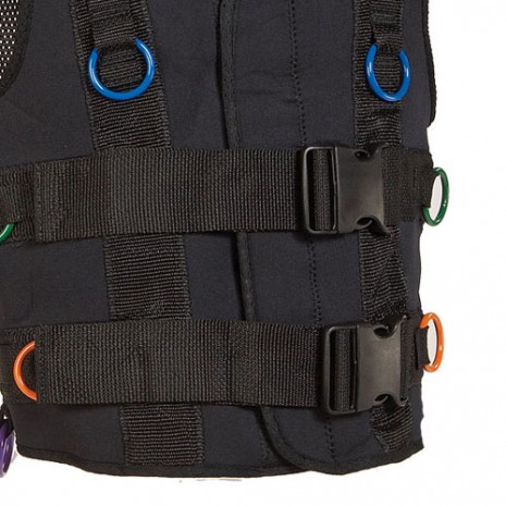 На жилет нашито 12 колец на уровне плеч, груди и талии, которые используются в качестве точек крепления тросов, амортизаторов.