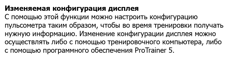 Данная функция необходима для сравнения нагрузок в различных типах тренировки. Она показывает насколько сильно тренировка подействовала непосредственно на организм занимающегося человека. Для определения границ возможностей и коррекции продолжительности тренировки предусмотрен такой контроль постоянной тренировочной нагрузки. Помимо этого, в соответствии с конкретными тренировочными задачами регулируется и интенсивность занятия.