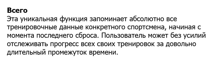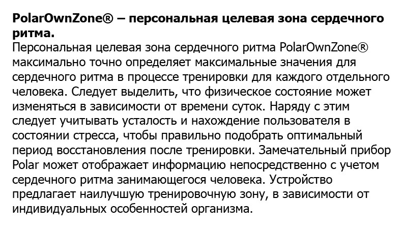 Такая опция позволит выявить правильную интенсивность тренировок, чтобы пользователь мог значительно улучшить состояние физической формы. Функция OwnZone делает эту непростую задачу максимально элементарной. Спортсмен будет полностью уверен в идеально выбранной интенсивности тренировки, которая не только укрепит мышцы, но и станет способствовать заметному улучшению аэробного состояния. Данная функция обеспечивает необходимую коррекцию диапазона частоты сердечных сокращений, чтобы пульс должным образом соответствовал физиологическому состоянию пользователя в текущий момент.