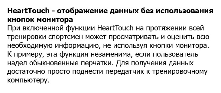 Индивидуальная программа тренировок STAR Training Program находится непосредственно на запястье у пользователя. Она создана исключительно для поддержания мотивации. Незаменимая программа руководства гарантирует высокую эффективность от каждого занятия. Прибор умещается на руке, постоянно отображая данные о времени и интенсивности тренировки. Регулярное использование пульсометра позволит практически без усилий реализовать все поставленные долгосрочные цели.