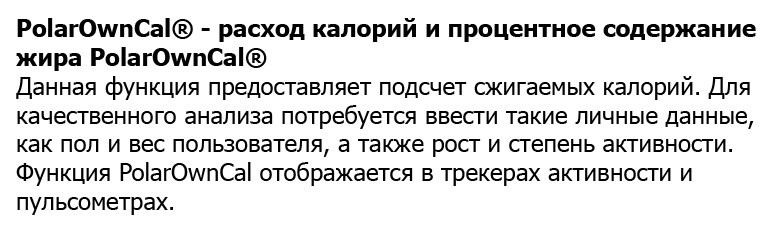 Для подсчета израсходованный калорий представлена опция OwnCal. Она рассчитывает количество затраченных калорий в процессе тренировки, в зависимости от выбранного роста, веса, пола, возраста и индивидуальных показателей максимальной ЧСС (HRmax). При этом также учитывается интенсивность тренировки.