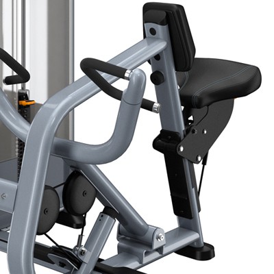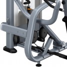Подвижный рычаг силового тренажера для выполнения гребли сидя имеет шарнир для соблюдения оптимальной траектории движения вперед-вниз и комфорта тренирующегося. Рукоятки имеют п-образную форму и расположены под углом, что обеспечивает большой диапазон исходных положений пользователя, при этом нет необходимости регулировать подушку для груди. Данная модель относится к серии Discovery Series линейке Selectorized Line.
