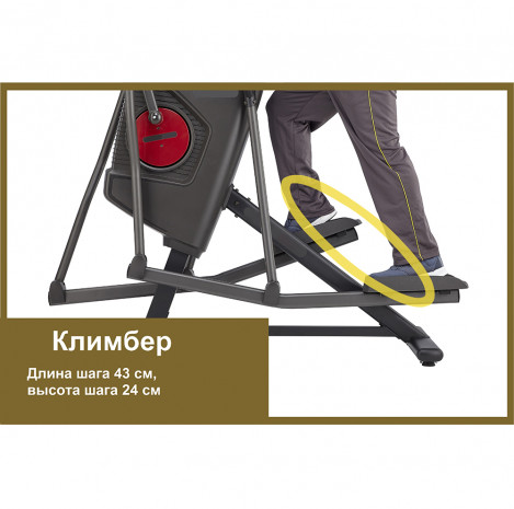 Климбер (эскалатор). Движение по овалу с наклоном вперед. Имитация подъема по лестнице, отличается отличной нагрузкой на все группы мышц. Длина шага 43 см, высота шага составляет 24 см
