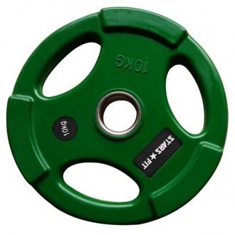 Олимпийский диск WP074-10 бренда PX-Sport – обрезиненный нескользящий диск зеленого цвета с тремя отверстиями для хвата. Вес диска 10 кг.