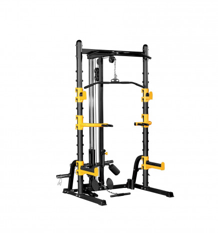 Многофункциональная полурама REBEL HR04 позволяет осуществлять не только различные тренировки со штангой (жим лежа, приседания), но и работу с грифом с использованием штатного ротомодуля (фиксатора грифа шарнирного). Нагружаемый свободными весами блок позволяет выполнять упражнения – верхняя / гребная тяга. Рукоятки входят в комплект поставки. Также полурама REBEL HR04 имеет встроенный турник и съемные регулируемые по высоте брусья, позволяющие выполнять упражнения на тренировку мышц брюшного пресса. Верхняя балка полурамы REBEL HR04 имеет встроенное кольцо, позволяющее крепить эспандеры или функциональные петли. Для удобства хранения дисков полурама оборудована двумя держателями (олимпийских дисков), одновременно выполняющими функцию стабилизаторов. Для вертикального хранения грифов предусмотрен спаренный стакан, рассчитанный на два грифа.