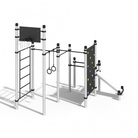 Спортивная площадка, на которой могут заниматься сразу несколько человек. Кто-то будет делать продвинутые упражнения для пресса на скамье, кто-то займется тренировкой на кольцах, а дети будут увлечены скалодромом. И еще останется место любителям растяжки.