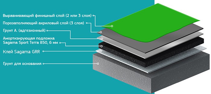 Для укладки спортивного покрытия на грунт основания на клей Sagama GRR укладывается амортизирующая подложка Sagama Sport Terra 850 толщиной 6 мм. Сверху укладывается адгезионный грунт, а затем 3 слоя порозаполняющего акрилового материала. Окончательным покрытием служат 2-3 слоя выравнивающего финишного материала.