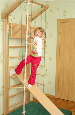 Для ребенка возрастом более 2 лет гимнастический комплекс можно дополнить веревочной лестницей, гимнастическими кольцами и деревянными качелями. Веревочную лестницу нужно закреплять у пола.