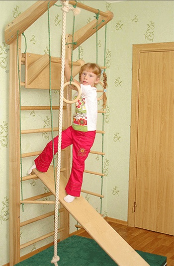 Для ребенка в возрасте 3-8 лет набор аксессуаров значительно расширен. Гимнастический комплекс можно дополнить горкой, трапецией, баскетбольным кольцом, веревочной лестницей, грушей и пр.