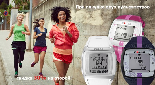При  покупке  сразу двух моделей из пульсометров Polar FT4, FT7 и FT60 (например мужская и женская), предоставляется 30% скидка на вторую модель.