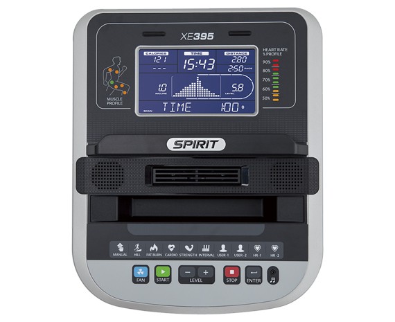 Эллиптический тренажер XE395 бренда Spirit Fitness оснащен регулируемой консолью, угол наклона которой может изменяться до 10°. Благодаря этому пользователи разного роста могут подобрать удобный угол обзора.