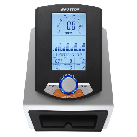 Эта модель эллиптического тренажера оснащена современной консолью с удобным LCD-дисплеем, на котором в постоянном отображаются текущие тренировочные показатели – пройденное расстояние, скорость, время, программа, уровень нагрузки, израсходованные калории, пульс и т.д. Консоль представляет собой настоящий тренировочный компьютер с «продвинутым» программным обеспечением, которое включает 12 предустановленных тренировочных программ. Программный пакет включает пульсозависимые, индивидуальные и целевые тренировки, программы контроля и восстановления пульса, Ватт-контроль. Возможности тренировок расширяют 24 уровня нагрузки, благодаря чему каждый пользователь может подобрать оптимальный режим тренировки в соответствии со своими физическими возможностями и тренировочными задачами. Для измерения пульса в неподвижные рукоятки тренажера встроены сенсорные кардиодатчики.