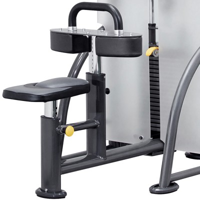 Силовой тренажер на верхнюю тягу оборудован упорным валиком, который регулируется по высоте и крепко фиксирует ноги при выполнении упражнения.