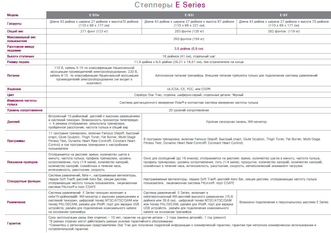 Степпер E-STe компании Star Trac cнабжен 38-сантиметровым сенсорным дисплеем обеспечивает возможность просмотра результатов тренировок при помощи простых функций и программ. USB-порт позволяет заряжать iPod и одновременно просматривать его контент. Педали Soft Trac обладают эффективной амортизационной системой, даря комфорт и безопасность каждой тренировке.