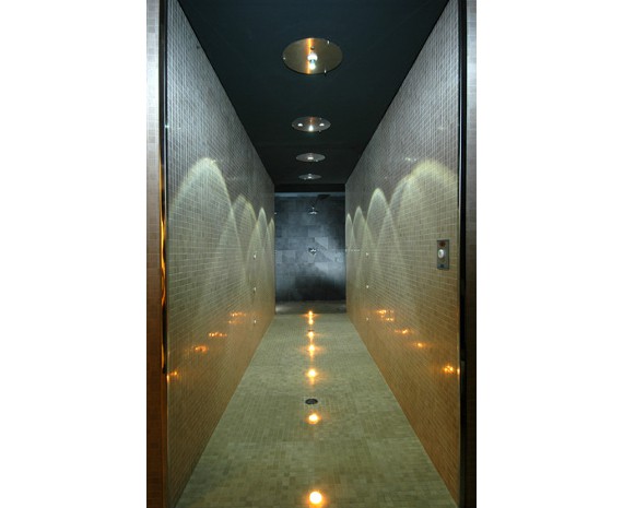 Если сделать одну стену душевой аллеи прозрачной, то процедура приобретет необычный дополнительный шарм.