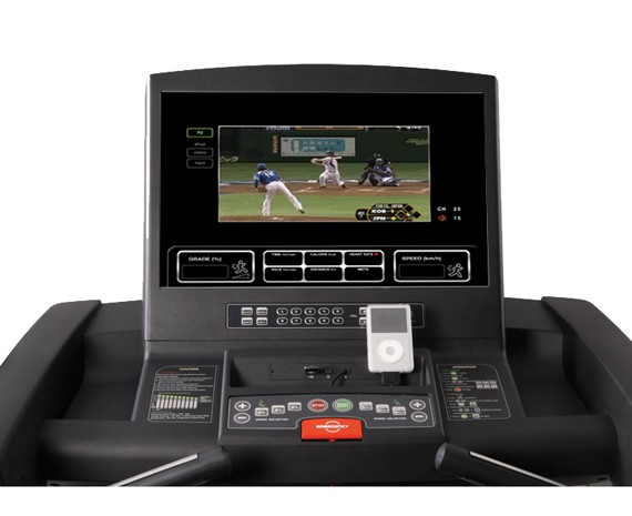 Сенсорный экран с диагональю 15 дюймов делает возможным внедрение новейших технологий, например, USB-хранение тренировки и виртуальный инструктор. Большая кнопка быстрого старта и клавиши управления углом наклона и скоростью позволяют вывести тренировки на новый уровень. Для большей безопасности предусмотрены два варианта экстренной остановки – при помощи кнопки и шнура безопасности. Сенсоры определяют момент входа «командира» на борт, система отображает приветствие на дисплее, а через 30 секунд после схода с тренажера электроника выключается, позволяя экономить электроэнергию. Амортизационная система бережет суставы, а улучшенные рукоятки расположены под наклоном, обеспечивая удобство хвата при быстром движении. Беговые дорожки оснащены сенсорами пульса, имеется возможность подключения USB и устройств iPod.