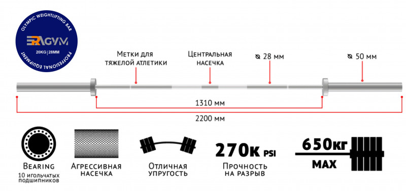 ERAGYM Olympic Weightlifting Bar 20 кг 1,98